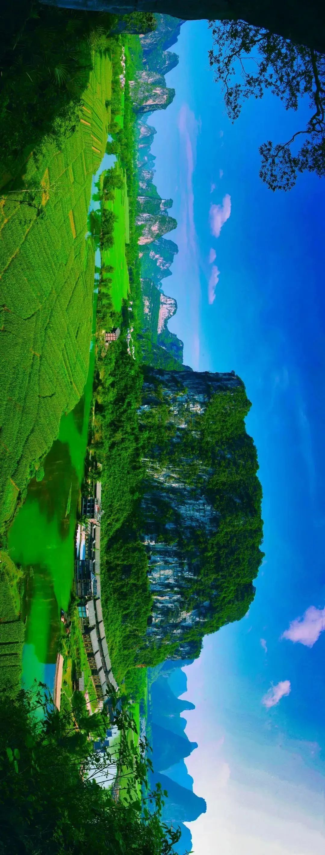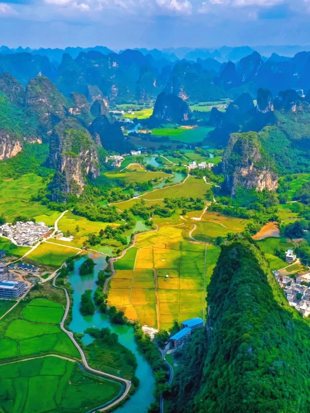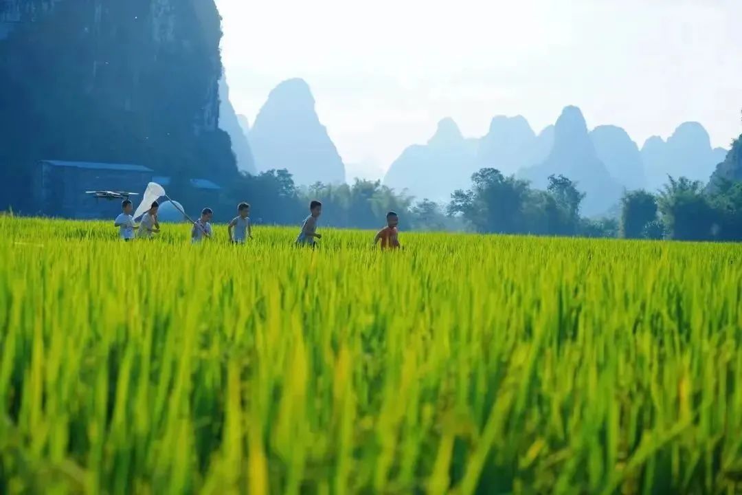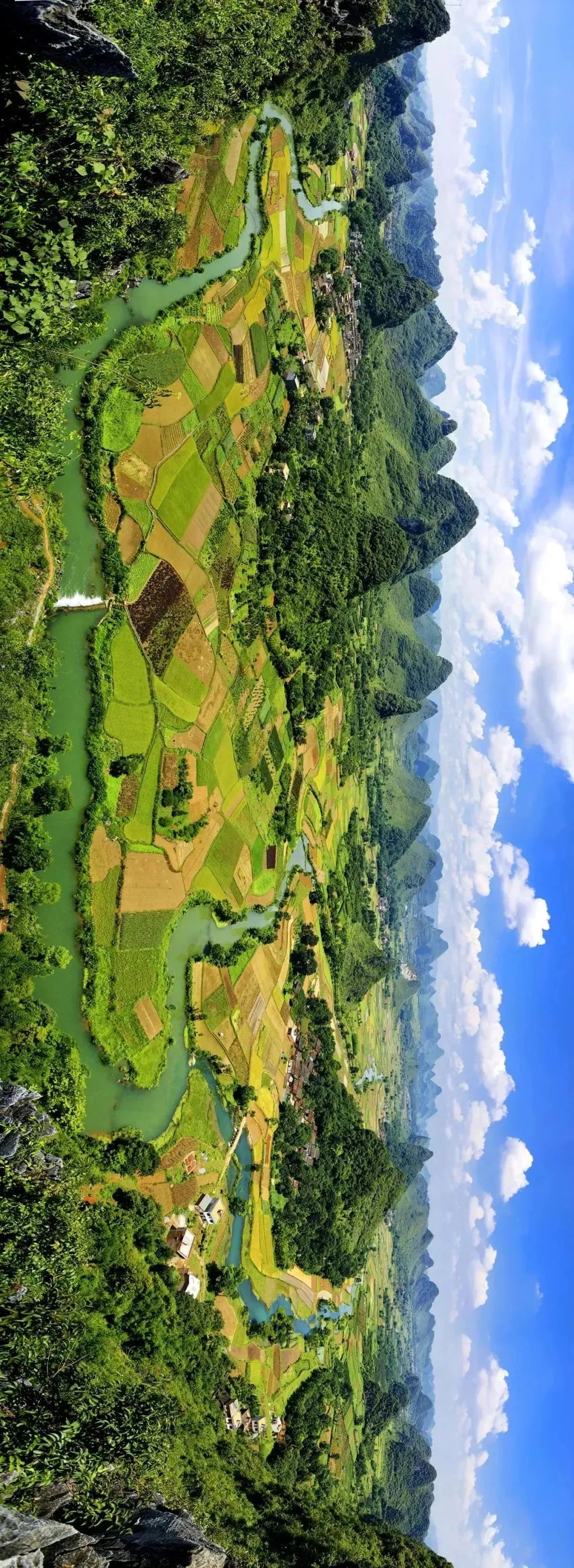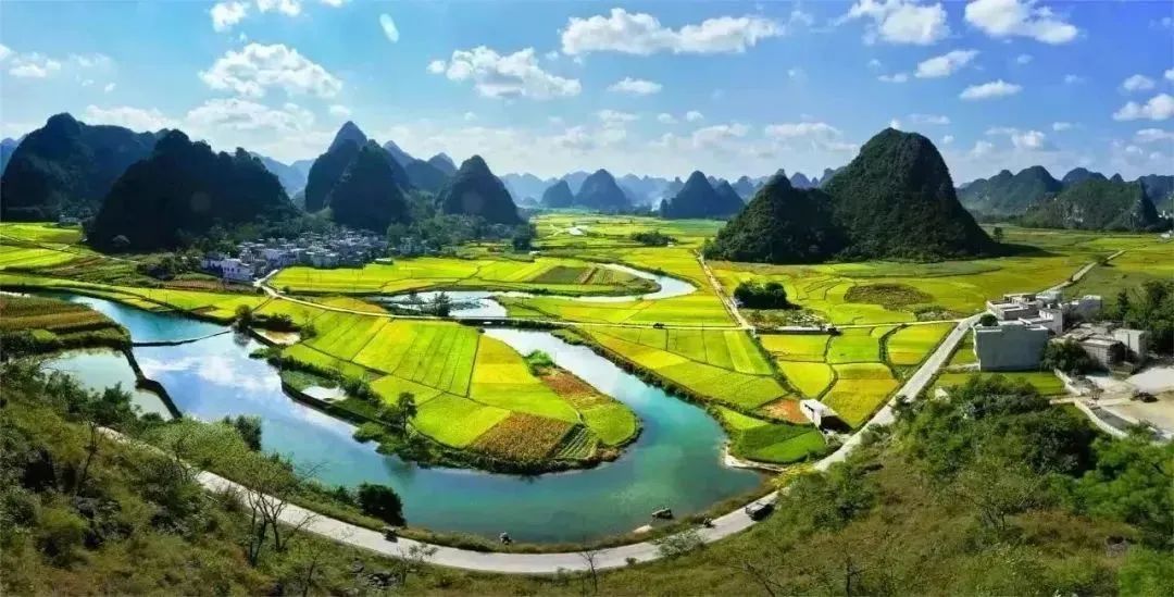 天等县都康田园景区有安保河、寿河两条蜿蜒曲折河流穿境而过,是广西边关徙步游玩线路中一颗闪耀的明珠,远山如画,水田如诗,壮情满满,被誉为“广西最美田园”。