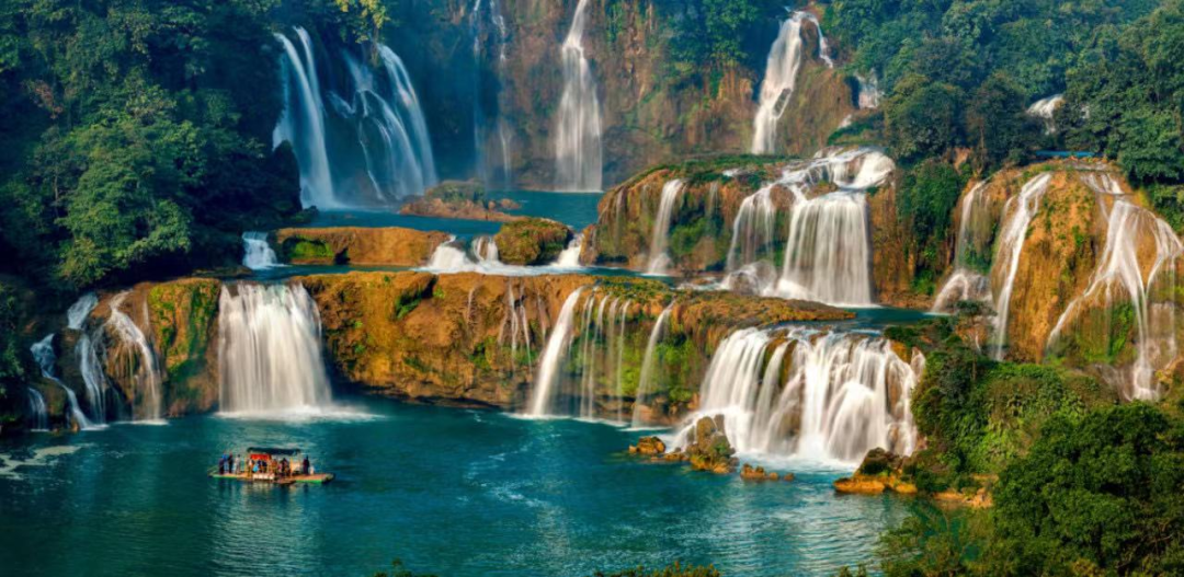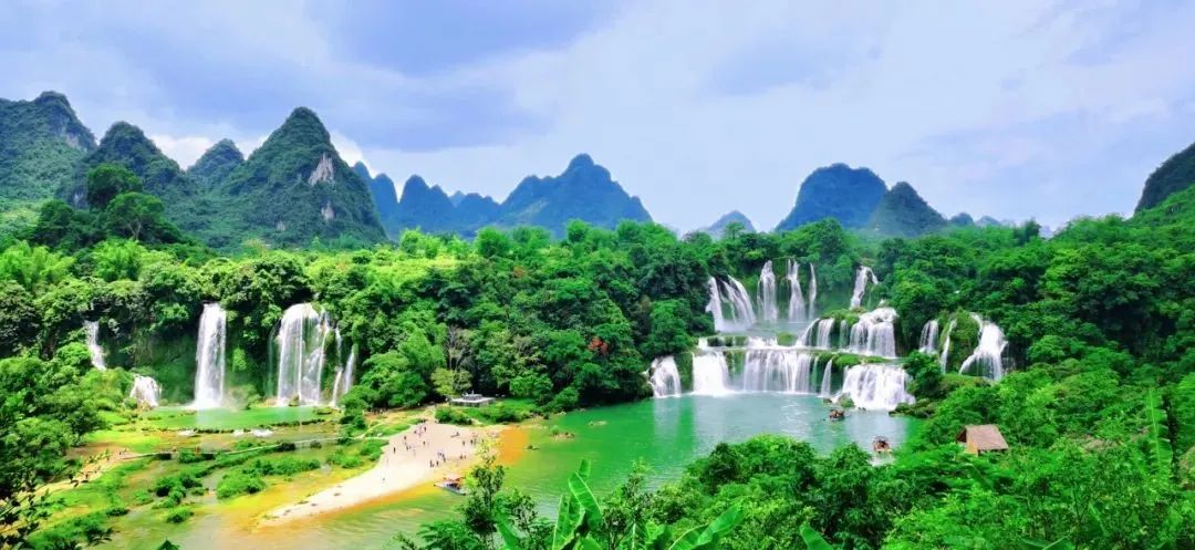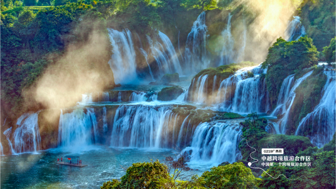 在广西的边境线上,归春河静静地流向越南,又绕回广西,最终在硕龙这个边陲小镇一泻千里,划开了中越两国边界,形成了亚洲第一世界第四的德天瀑布。不同于国内其他的瀑布,在河岸上即可欣赏越南的风光 -板约瀑布景区。看着越南的游客在岸边漫步别也有一番风情。德天瀑布虽没有黄果树瀑布高,但却是亚洲水流量最为丰富的瀑布,阶梯式的分布就像巨大的帘幕挂在山水之间,形成独特壮观震撼的景象。