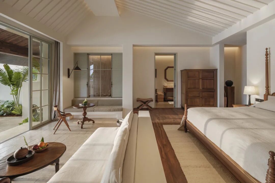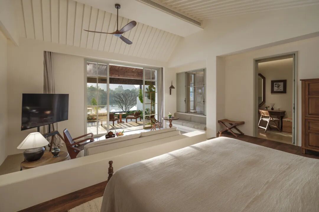 客房是专属的观景窗。晨起推窗,喀斯特峰林在薄雾中缓缓显露轮廓,远处田园与村落宁静点缀——宛如一幅鲜活的明仕山水图。室内以柚木、藤编与本地织品铺陈出温润质朴的基调。可以倚在窗畔榻上,静观日光在峰峦间游移,聆听风穿过蕉叶的簌簌声响;亦可步入露台,让自己全然沉浸于这片无垠的青绿与安谧之中。