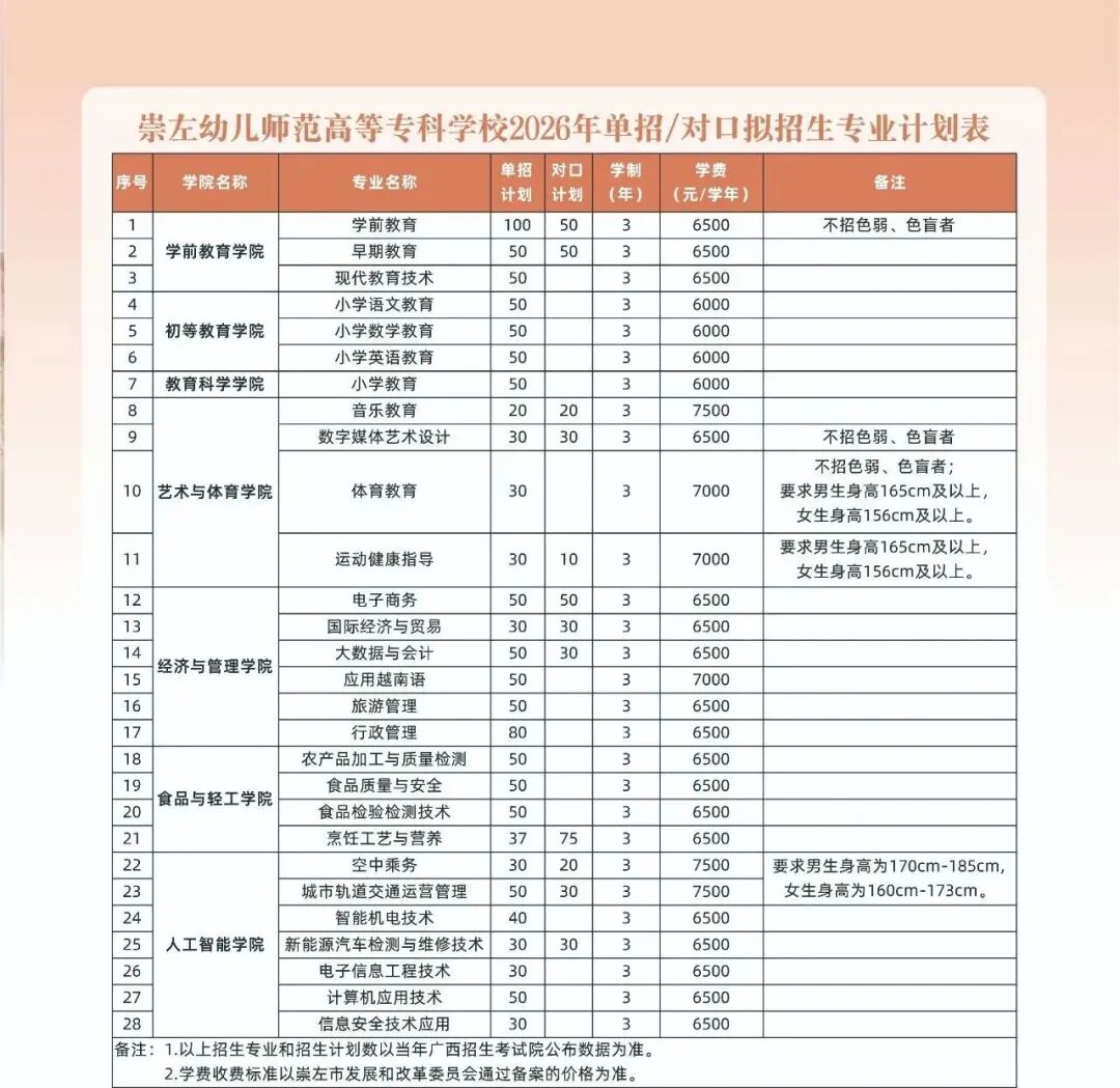 崇左幼儿师范高等专科学校崇左幼儿师范高等专科学校地处祖国西南边陲城市—崇左市,是自治区人民政府批准设置、教育部备案的公办全日制普通高等专科学校。学校分为校本部、北校区两个校区,设有一所附属幼儿园,形成“一校两区一园”办学格局。学校总占地面积1202.8亩,其中校本部占地面积617亩、北校区中专部占地面积535亩、附属幼儿园占地面积50.8亩。学校现有全日制在校学生17527人,其中大专学生14444人、中专学生2463人、附属幼儿园学生620人。学校全面推进内涵建设,努力实现建设特色鲜明、开放发展、校园和谐、社会满意的高水平幼儿师范院校的目标。