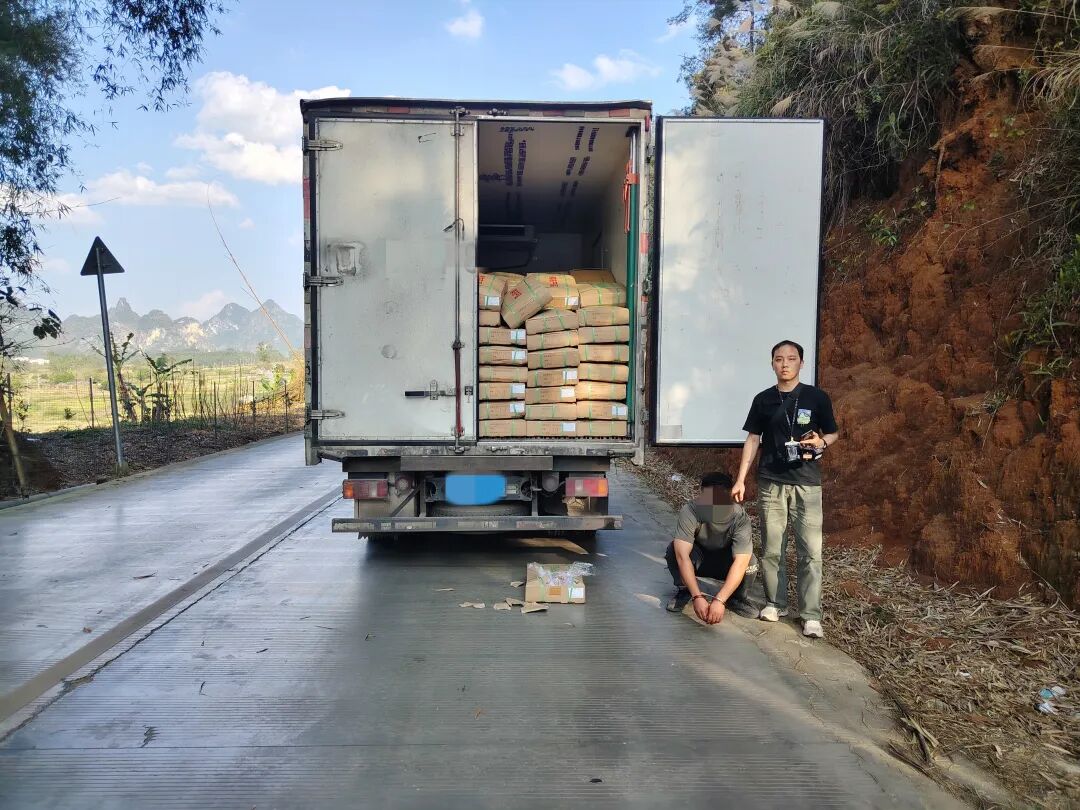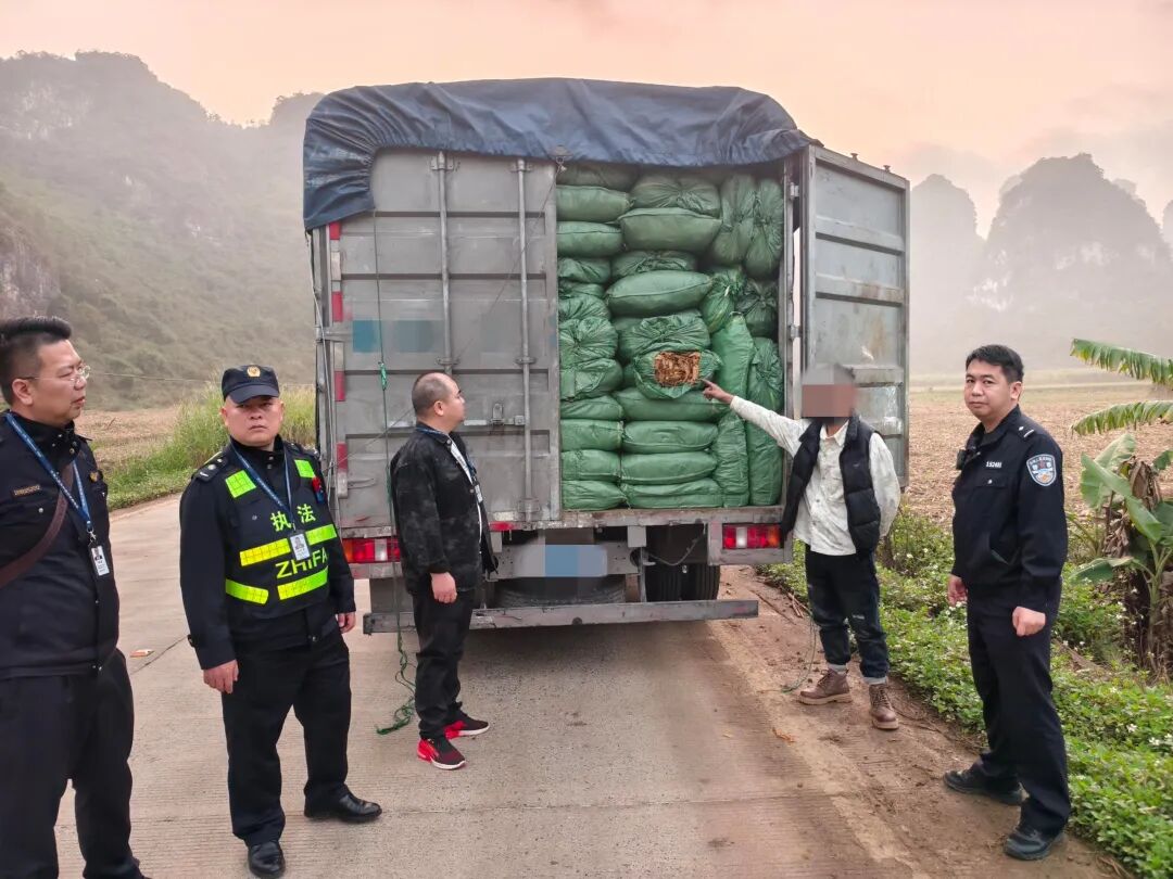 2月27日,大新县公安局与县烟草专卖局再次联手,在大新县那岭乡大新西高速路口附近成功查处一起无证运输烟草专卖品案件。行动当场抓获涉案嫌疑人1名,依法查扣涉案车辆1台,并查获烟叶8633千克,涉案金额达40.81万元。连续的成功查缉,对烟草走私违法活动形成了有力震慑。